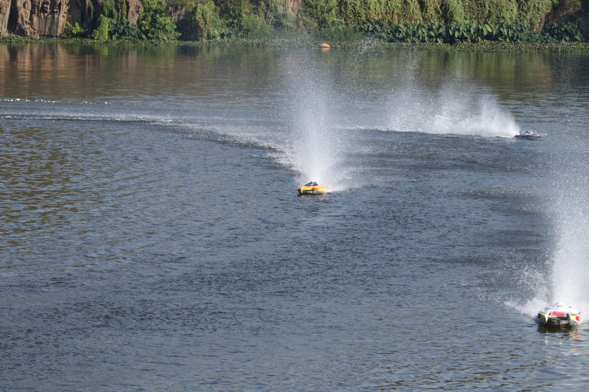 Official practice. Unfortunately, same old story, some going well, a lot spannering. Let's go back to Del. Del was warned that due to the wind conditions changing, the water hyacinth had moved in a bit and that he couldn't run the wide line on his hydro. Maybe Del had his ear plugs in, but showed that even his hydro couldn't match the strength of said weed. And then along came Henri, the cardinal sin in RC boating, do not, I repeat, do not, hit the rescue boat. Well Henri managed that feat and secured the chicken for the day, albeit closely followed by the Namibian contingent again, with De Waal arriving from the airport and showing one and all how you can manouevre an inboard F1 boat over the bank, ala motocross style, and then quite literally giving the clerk of the course a secondary heart failure by trying to run over and through Del's boat.